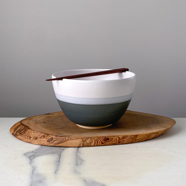 Wheel thrown ramen bowls, double dipped in our Muji gray and satin white glazes.